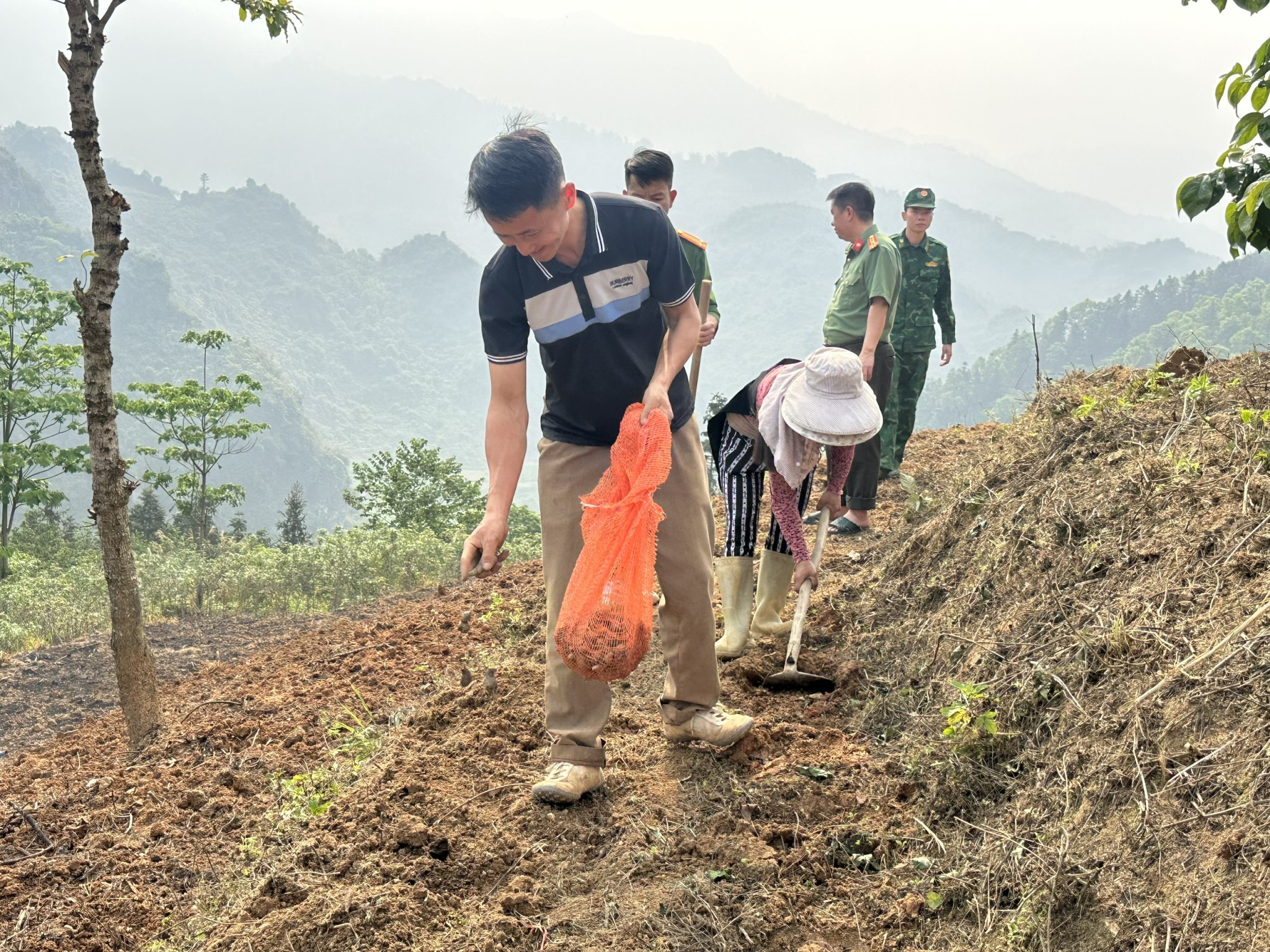 Anh Mua Mí Vư, thôn Ma Sào Phố vui vẻ tham gia trồng khoai cùng các lực lượng.