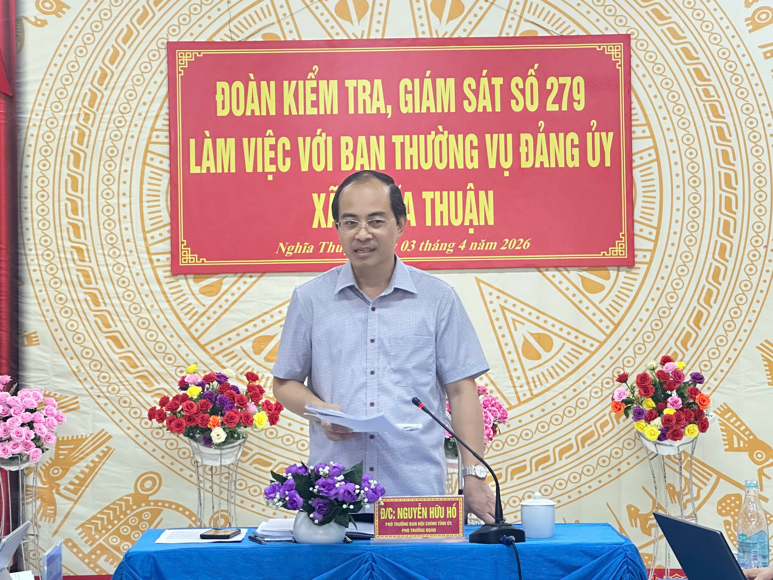 Phát biểu kết luận buổi làm việc, đồng chí Nguyễn Hữu Hồ ghi nhận và đánh giá cao những kết quả mà xã Nghĩa Thuận đạt được. Đồng chí đề nghị trong thời gian tới, địa phương tiếp tục nâng cao chất lượng công tác lãnh đạo, chỉ đạo; tăng cường kiểm tra, giám sát; đặc biệt quan tâm đẩy nhanh tiến độ giải ngân nguồn vốn đầu tư công, bảo đảm hiệu quả, đúng quy định; phối hợp chặt chẽ với các lực lượng chức năng trong quản lý, bảo vệ vững chắc đường biên, mốc giới; giữ vững an ninh chính trị, trật tự an toàn xã hội trên địa bàn. Đồng thời, nâng cao vai trò của Ban Chỉ đạo 35 xã trong công tác nắm bắt tình hình, định hướng dư luận, đấu tranh phản bác các quan điểm sai trái, thù địch.