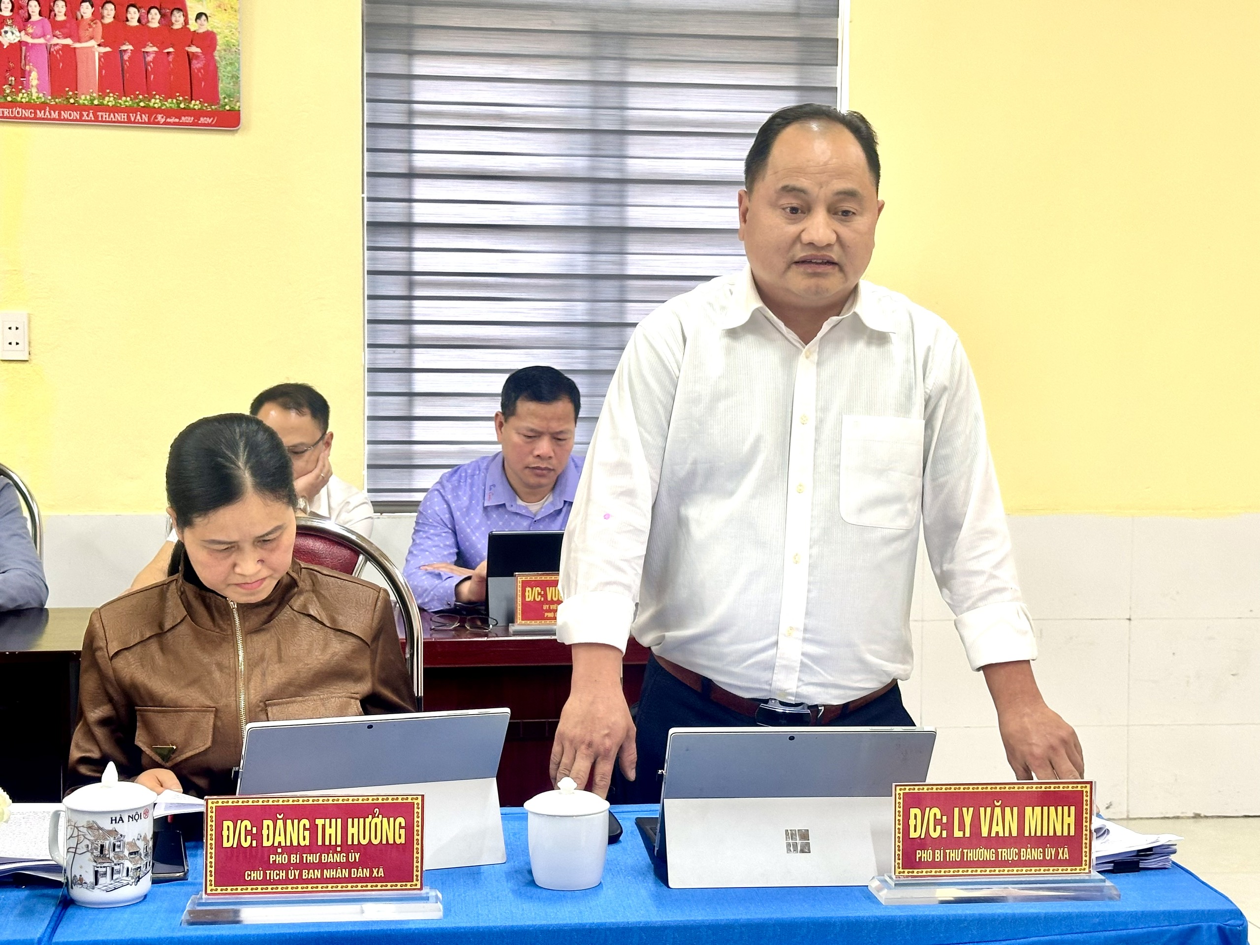 Đồng chí Ly Văn Minh, Phó Bí thư Thường trực Đảng ủy xã Nghĩa Thuận phát biểu thảo luận tại buổi làm việc.