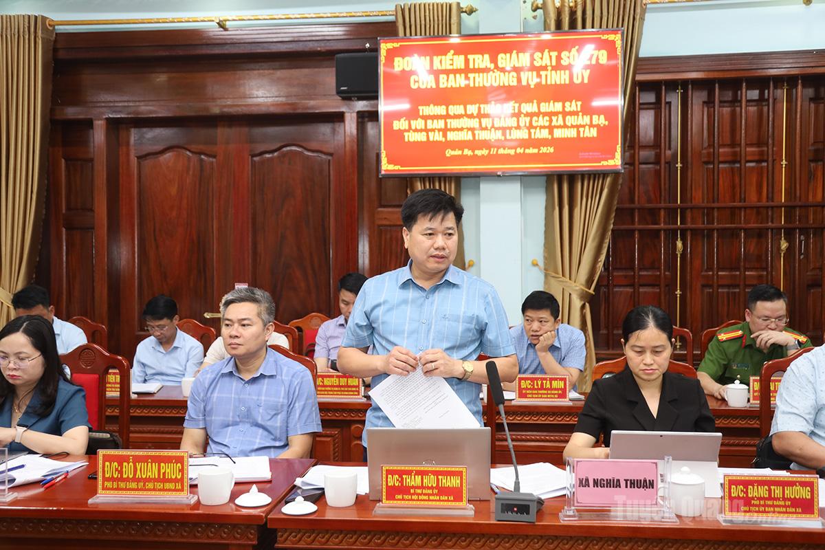 Tại buổi làm việc, đại diện Đoàn kiểm tra, giám sát số 279 đã trình bày tóm tắt dự thảo báo cáo kết quả giám sát đối với Ban Thường vụ Đảng ủy các xã. Nội dung giám sát tập trung vào việc lãnh đạo, chỉ đạo triển khai thực hiện Nghị quyết Đại hội XIV của Đảng; Nghị quyết Đại hội Đảng bộ tỉnh lần thứ I, nhiệm kỳ 2025–2030 và các chương trình hành động thực hiện nghị quyết; kết quả triển khai Chỉ thị số 46, ngày 16/5/2025 của Bộ Chính trị về lãnh đạo cuộc bầu cử đại biểu Quốc hội khóa XVI và đại biểu HĐND các cấp nhiệm kỳ 2026–2031 cùng các văn bản liên quan.