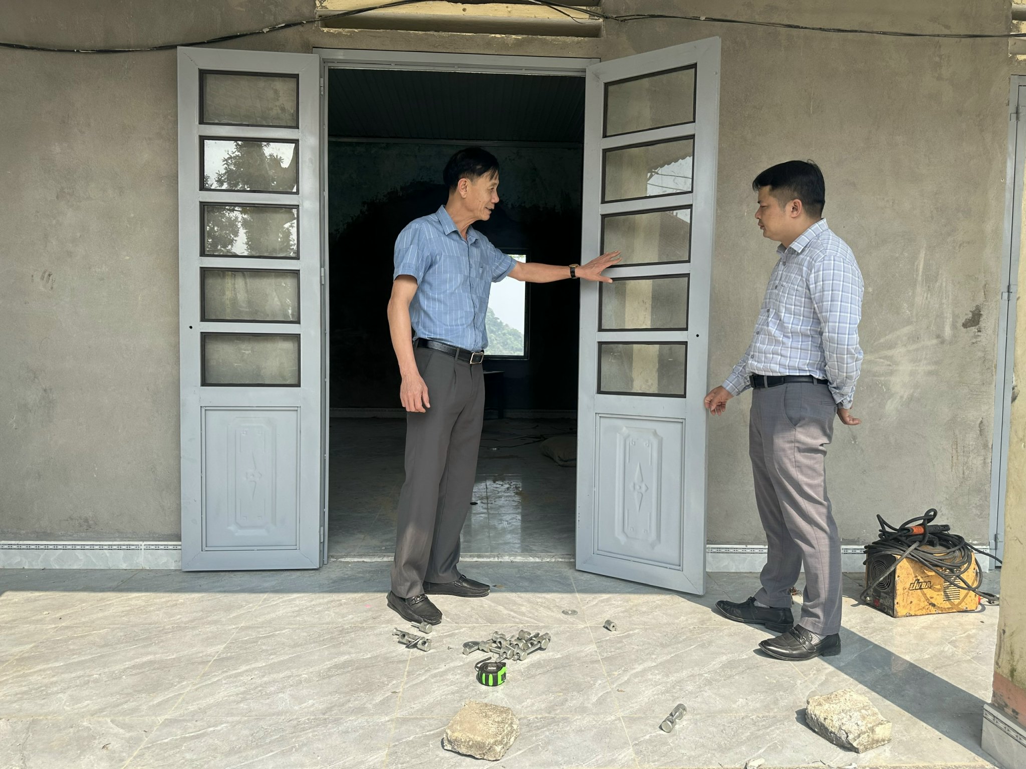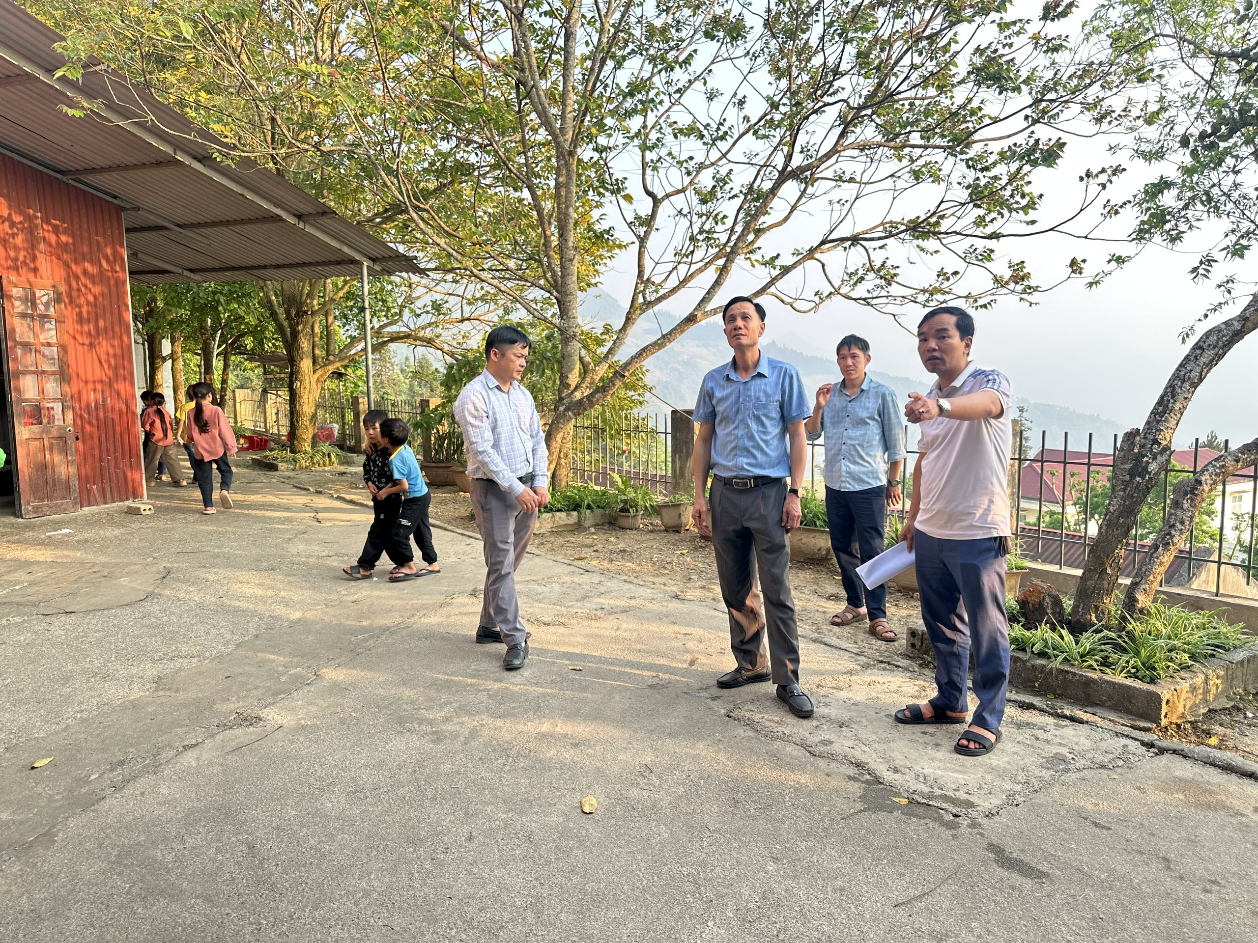 Đồng chí Phan Văn Trình, Phó chủ tịch UBND xã khảo sát địa điểm dựng nhà lắp ghép bán trú cho học sinh.