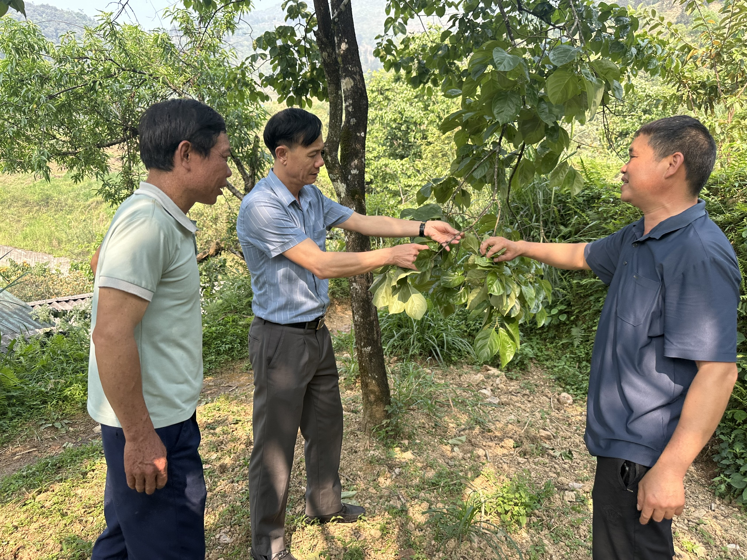 Tiếp đó, đoàn công tác đã đến kiểm tra một số hộ gia đình trồng Hồng không hạt tại thôn Phín Ủng và Pả Láng. Tại đây, các hộ dân đã báo cáo nhanh với đoàn về tình hình sinh trưởng, phát triển của diện tích cây Hồng trồng mới cũng như diện tích trồng lâu năm đã cho thu hoạch. Hiện nay, bà con đang tiến hành phun thuốc phòng trừ sâu bệnh lần thứ 3; tuy nhiên, bệnh thán thư vẫn xuất hiện trên một số diện tích.