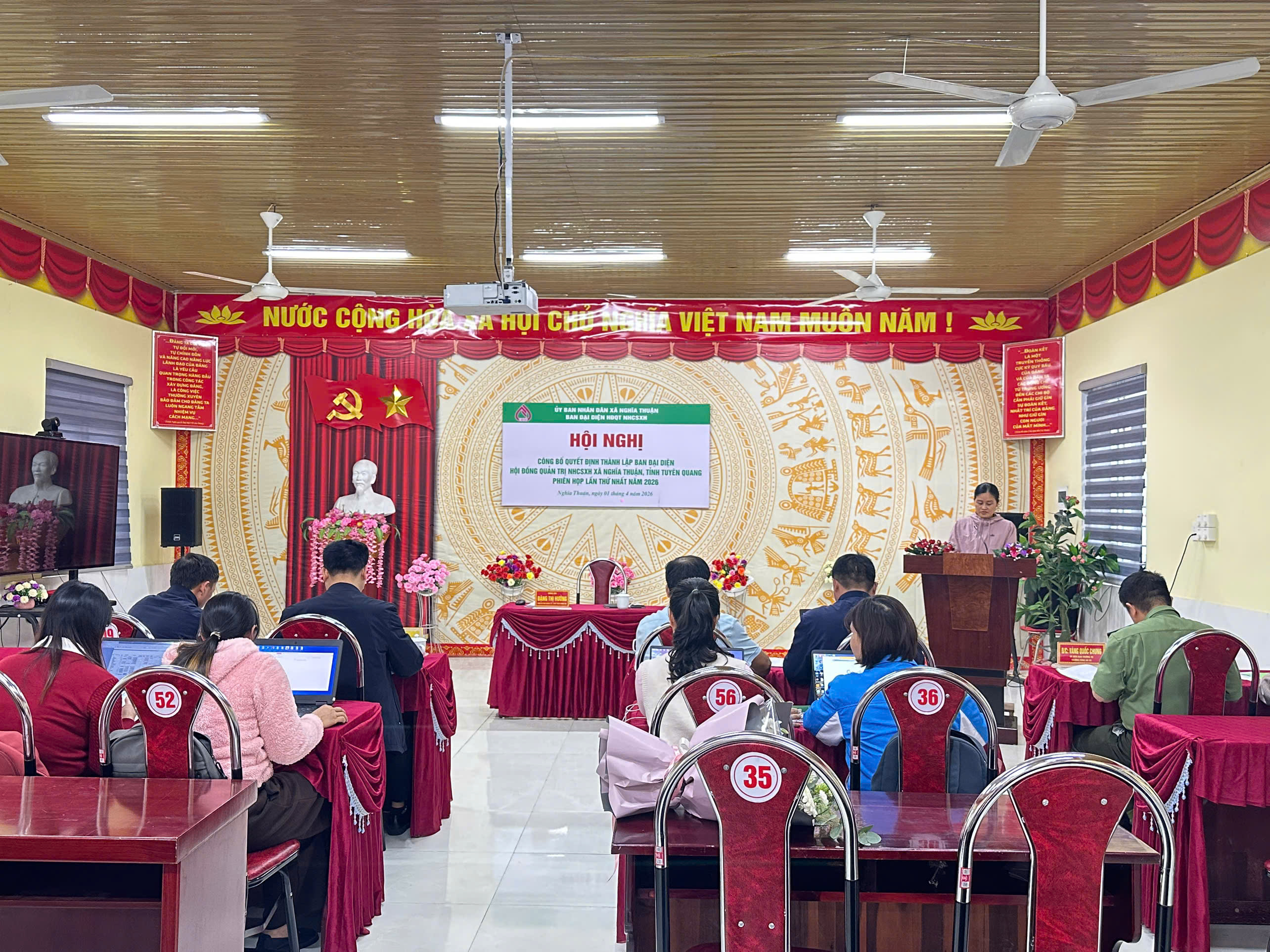 Tại buổi lễ, các đại biểu đã nghe công bố Quyết định của UBND xã Nghĩa Thuận về việc thành lập Ban đại diện Hội đồng quản trị NHCSXH xã. Theo đó, Ban đại diện gồm 4 thành viên: bà Đặng Thị Hưởng – Phó Bí thư Đảng ủy, Chủ tịch UBND xã giữ chức Trưởng Ban; ông Phan Thông Quyết – Ủy viên Ban Thường vụ Đảng ủy, Chủ tịch Ủy ban MTTQ Việt Nam xã là thành viên; ông Dương Văn Minh, UV BTV Đảng uỷ xã - Trưởng phòng Kinh tế xã thành viên; ông Phạm Quang Hưng – Giám đốc Phòng Giao dịch NHCSXH huyện Quản Bạ là thành viên chuyên trách.