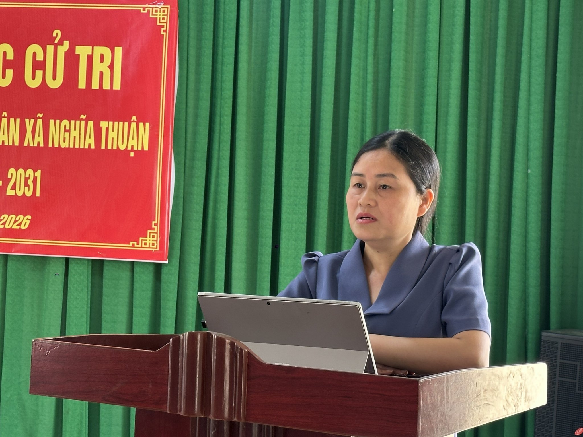Bà Đặng Thị Hưởng, Phó Bí thư, Chủ tịch UBND xã phát biểu, giải đáp những kiến nghị của cư tri thuộc thẩm quyền của xã.