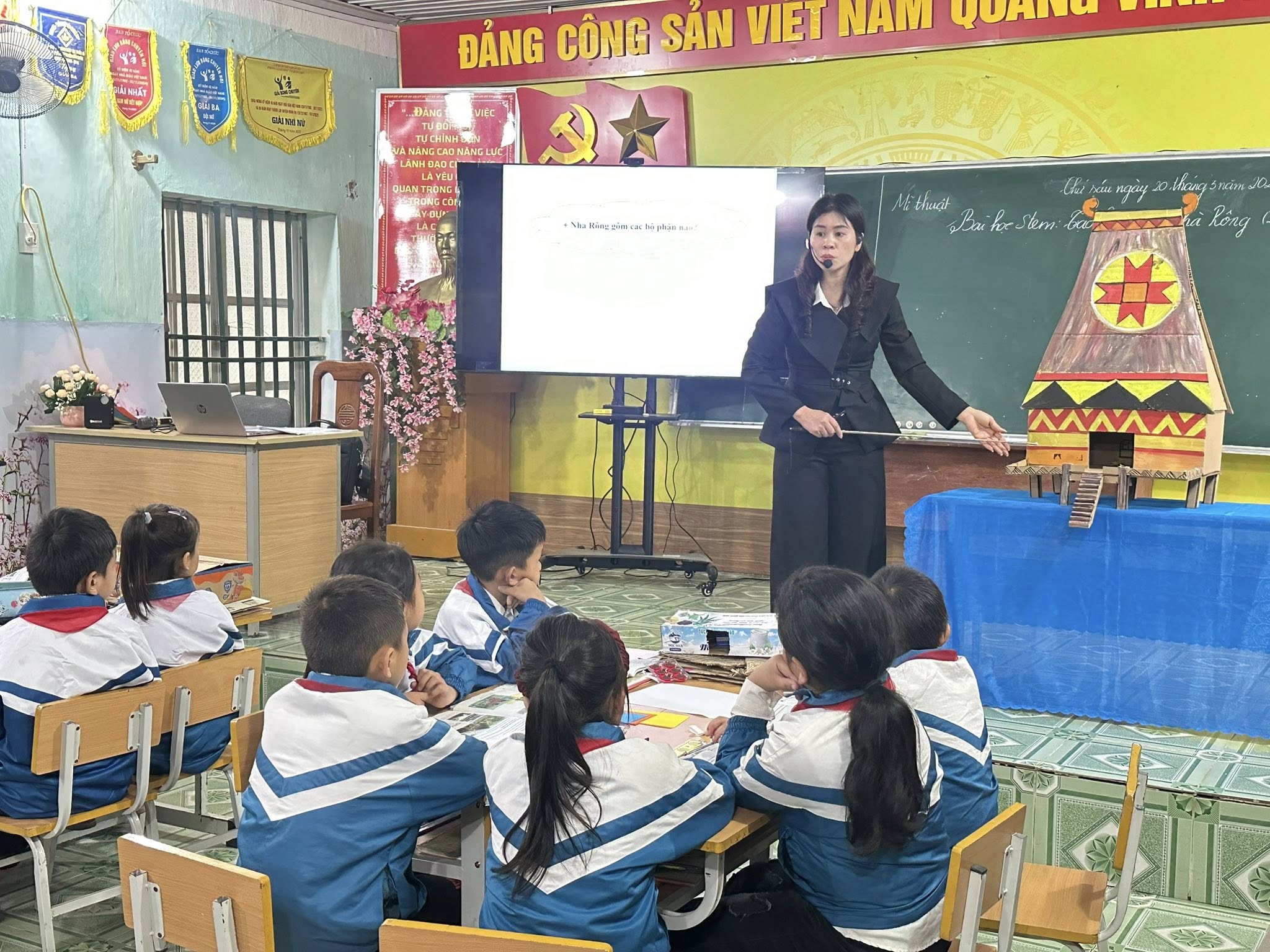Tại buổi sinh hoạt, các đại biểu đã dự giờ tiết dạy STEM theo hướng nghiên cứu bài học với chủ đề: “Tạo hình nhà Rông” (lớp 4A1, môn Mĩ thuật chủ đạo, tích hợp kiến thức Toán, Lịch sử và Địa lý). Tiết học được chuẩn bị công phu, phát huy tính chủ động, sáng tạo của học sinh, đồng thời thể hiện rõ tinh thần đổi mới phương pháp dạy học theo định hướng giáo dục STEM.