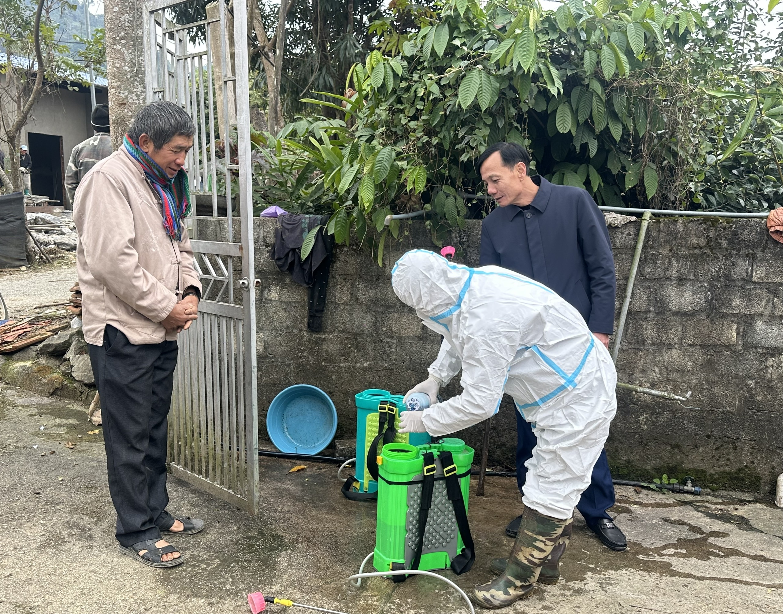 Tiến hành pha thuốc tiêu độc phun khử trùng tại các hộ chăn nuôi.